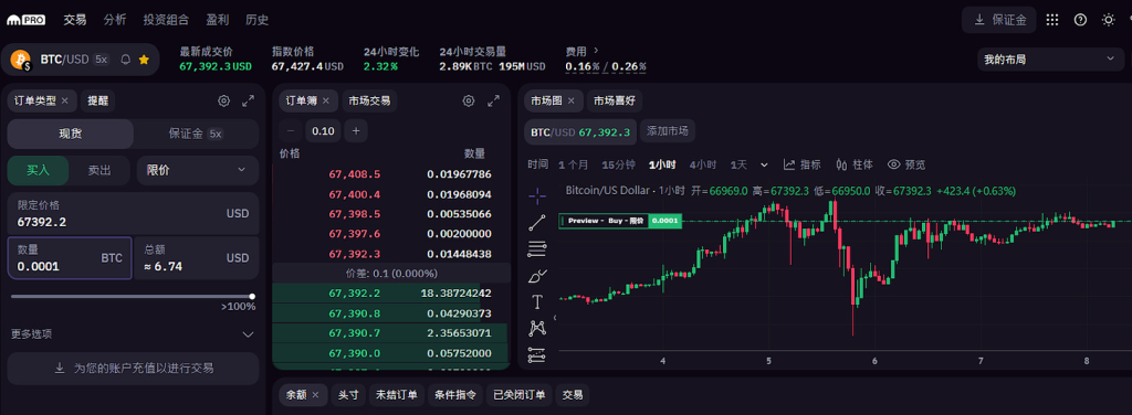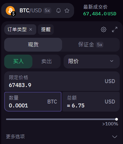 界面非常简洁,现货是基本的币币现货交易,保证金则是杠杆交易,限价、市价、数量都可以在这里直接设置。