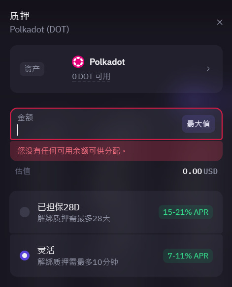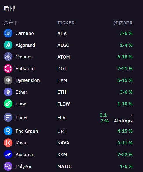这部分不是链上质押,更接近活期理财产品,但提供的币种选择不多。