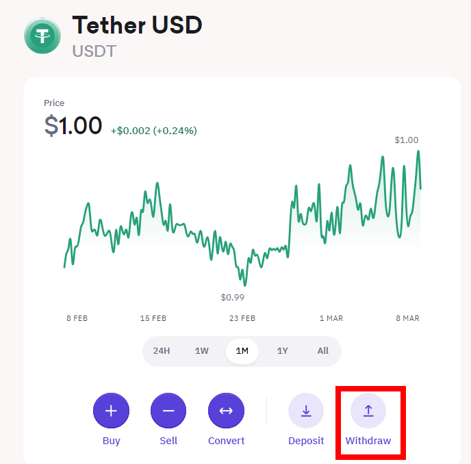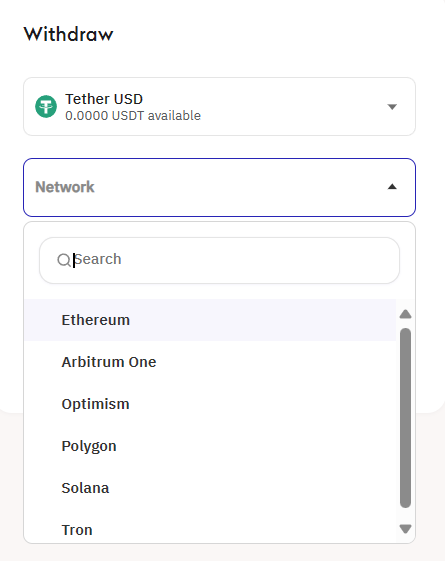 Withdraw 是提现出金功能,第一步同样是选择链,这次要转到哪条链上的地址?